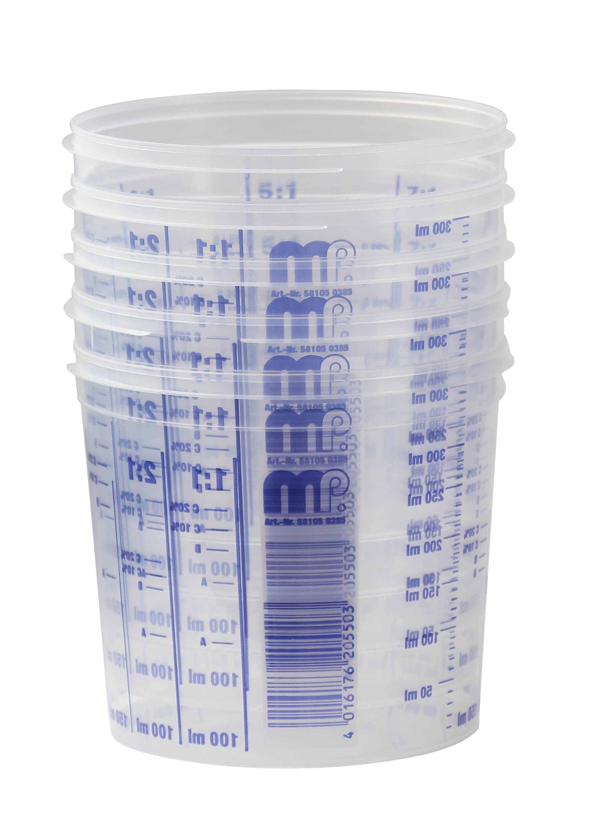 Hierfür haben die Mischbecher verschiedene Mischungsverhältnisse und Füllmengen aufgedruckt.